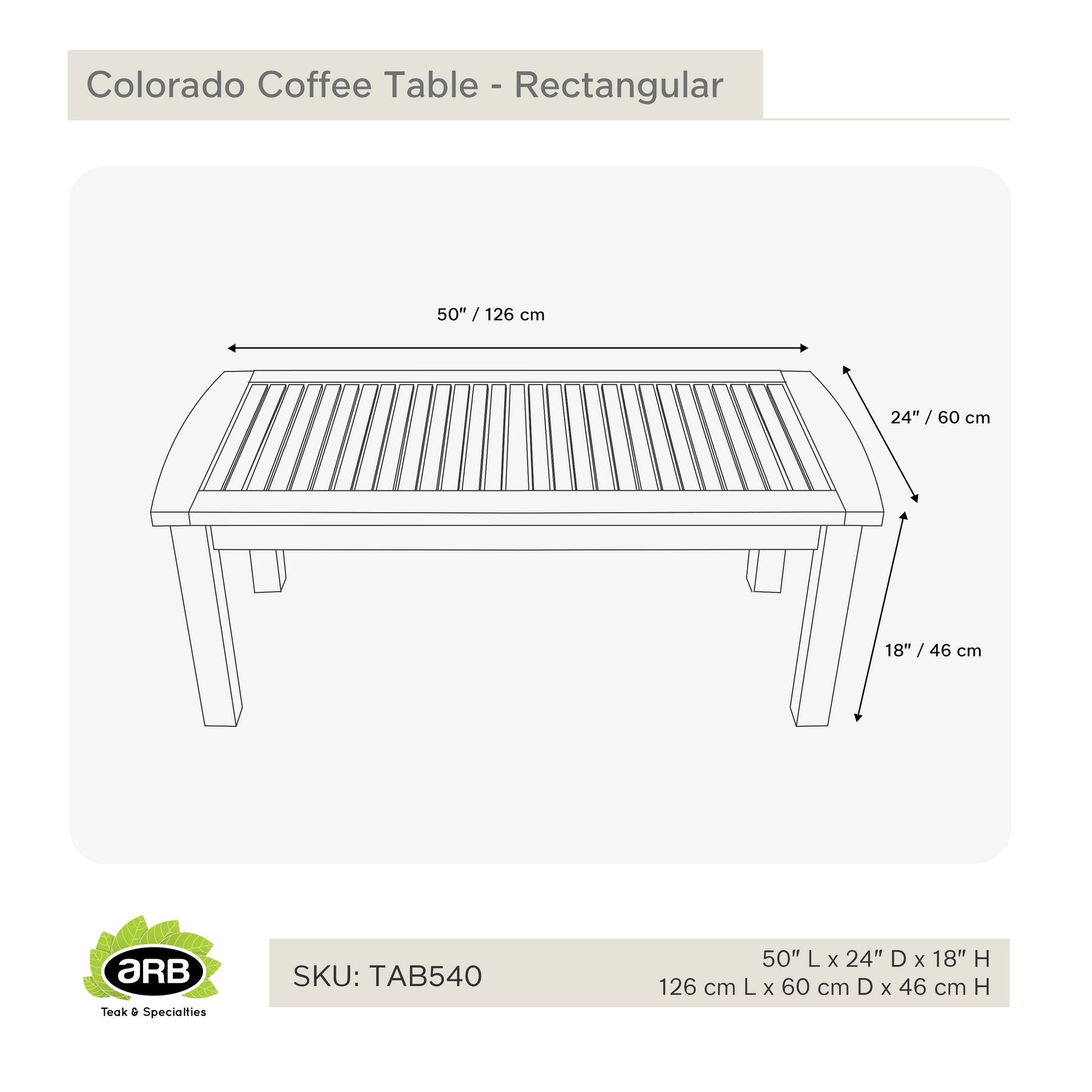 The Teak Coffee Table Colorado - Rectangular 50 x 24" is a testament to the enduring beauty and functionality of teak wood. This table, designed by ARB Teak & Specialties, is a versatile piece that complements both indoor and outdoor settings, offering a robust surface for your living room or patio. Its natural resistance to the elements and minimal maintenance requirements make it a wise choice for anyone looking to enhance their living space with a piece that combines practicality with natural elegance.